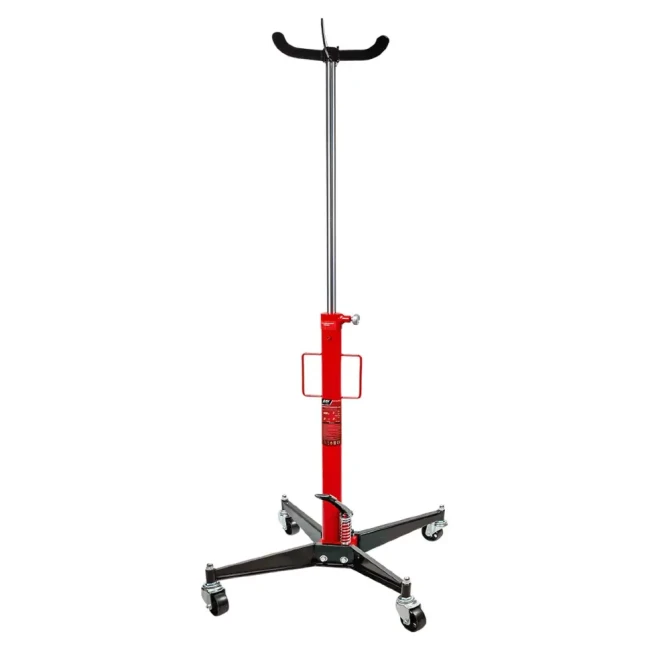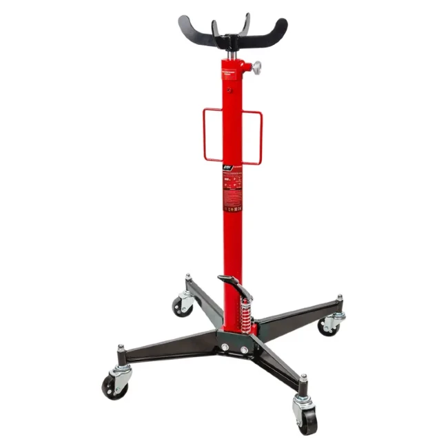 Стойка трансмиссионная гидравлическая, предназначена для безопасного и удобного монтажа и демонтажа автомобильных коробок передач (КПП), а также других тяжелых агрегатов. Подъемное устройство обеспечивает точное и дозированное позиционирование груза в пределах рабочего диапазона 760 мм, от минимальной высоты 1120 мм до максимальной 1880 мм. Грузоподъемность стойки составляет 600 кг. Конструкция включает четыре поворотных металлических колеса для маневренности и оснащена надежным гидравлическим механизмом подъема, управляемым ножным насосом, и ручным клапаном для контролируемого опускания. Для безопасности использования необходимо ослаблять винт при работе подъемного механизма. Стойка предназначена для применения на твердой, ровной поверхности в условиях автосервисов и ремонтных зон.