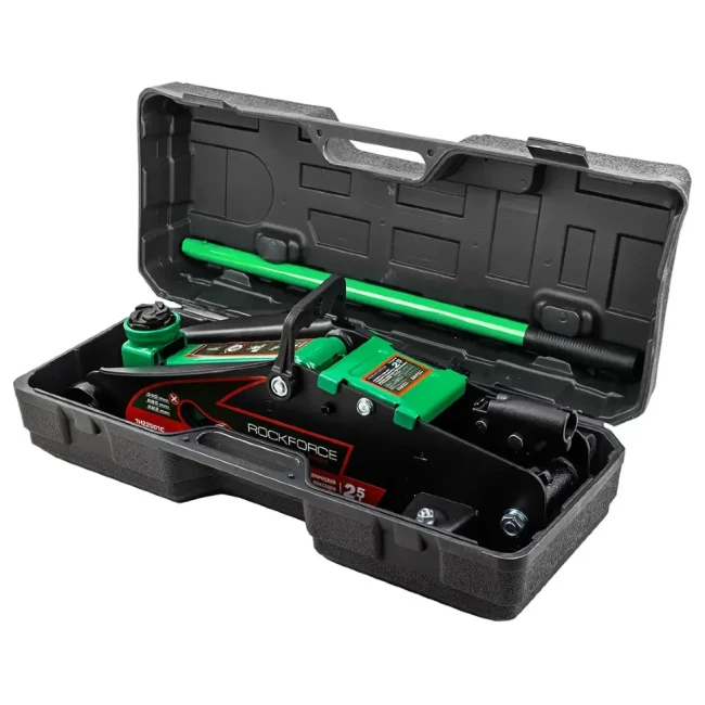 Вид домкрата подкатной с фиксацией. Механизм гидравлический. Грузоподъемность 2,5 тонны. Минимальная высота подъема 140 мм. Максимальная высота подъема 387 мм. В пластиковом кейсе.