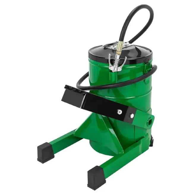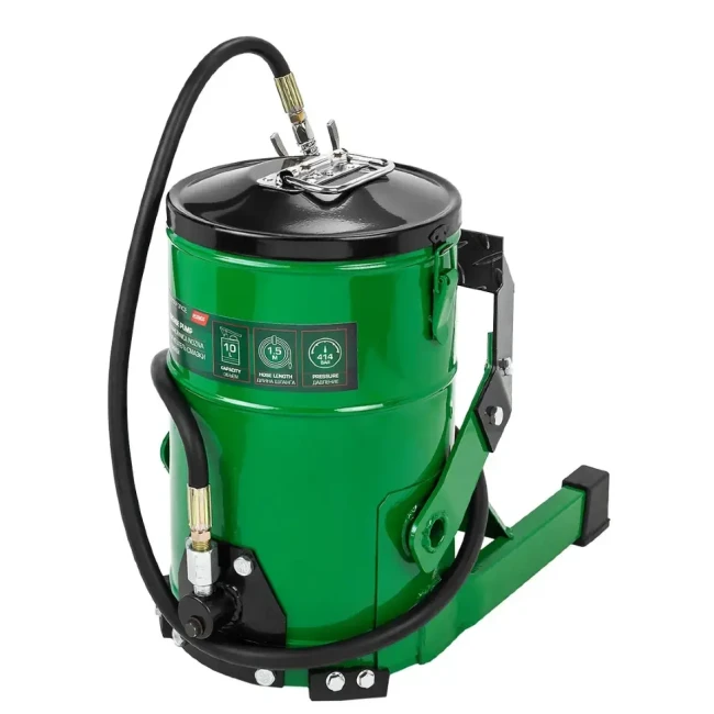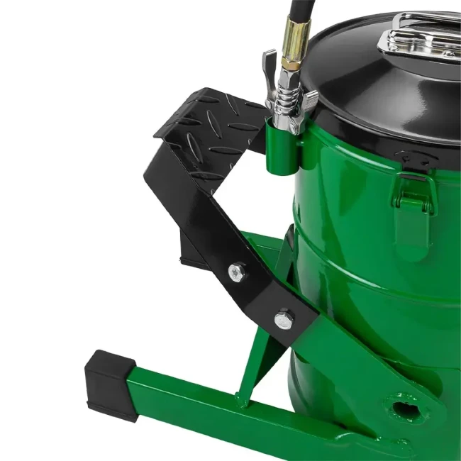 Солидолонагнетатель с ножным приводом представляет собой мобильную установку на платформе, комплектуется шлангом с 4-х лепестковым наконечником. Тип насоса: ножной. Закладка емкости: 10 кг. Длина шланга:1,5 м. Диаметр емкости: - 210мм. Внутренняя высота: - 310 мм. Рабочее давление 414бар. Мобильная конструкция и небольшой вес позволяют обслуживать технику как на территории ремонтной зоны, так и в местах стоянки. Все элементы устройства выполнены из материалов, устойчивых к воздействию агрессивных химических веществ. Устройство служит для смазывания элементов ходовой части и шарнирных соединений грузовых, легковых автомобилей и других транспортных средств в сфере ремонта и обслуживания механизмов и агрегатов. С его помощью Вы сможете обеспечить надежное покрытие контактирующих деталей нужным слоем масла. Нагнетатель смазки позволяет подавать под давлением густое масло к трущимся деталям различных механизмов. Благодаря ему исключается необходимость применения механиками значительных усилий, чтобы подать смазку.