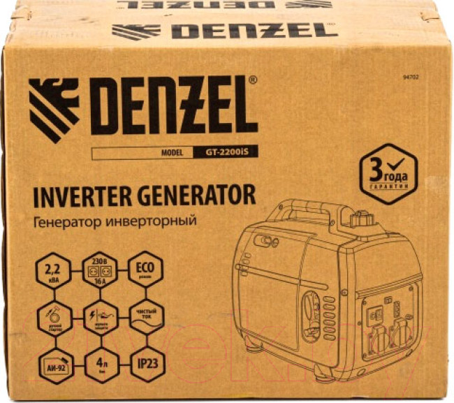 Инверторный генератор Denzel GT-2200iS 94702 мощностью 2,2 кВт, в закрытом корпусе, с ручным стартом, — легкий и экономичный, но при этом достаточно мощный, с ним легко справится даже неопытный пользователь. Идеально подходит для выездов на природу и рыбалку, но также будет незаменим на дачном участке и в торговой палатке. Четырехтактный двигатель мощностью 3,2 л.с. и объемом 113 куб. см работает стабильно и имеет небольшой уровень шума 57 дБ.