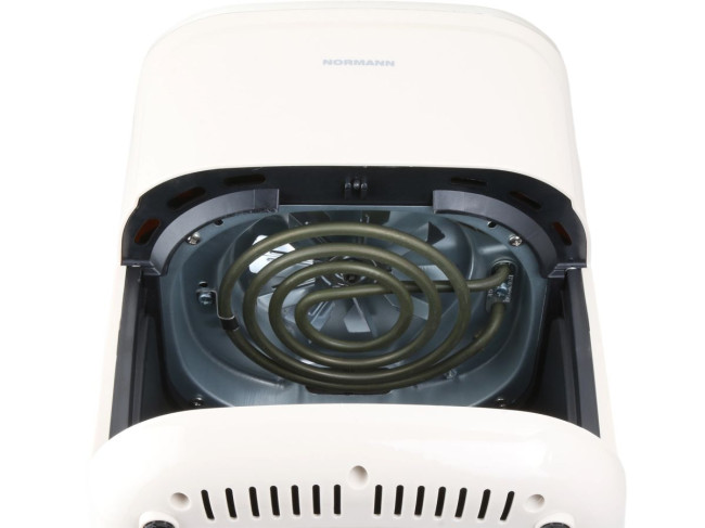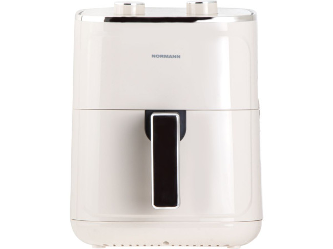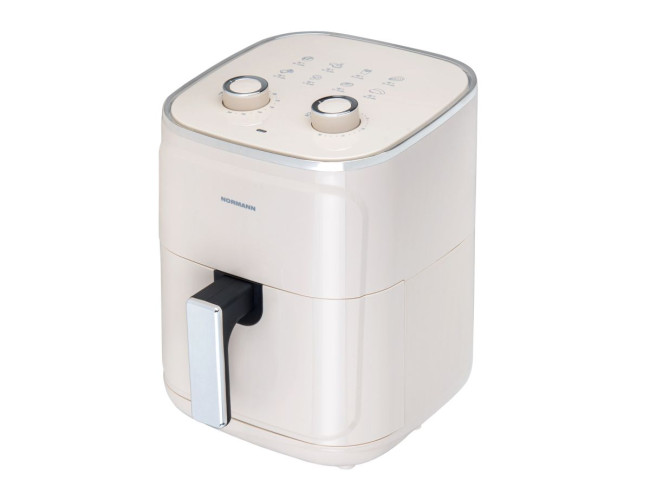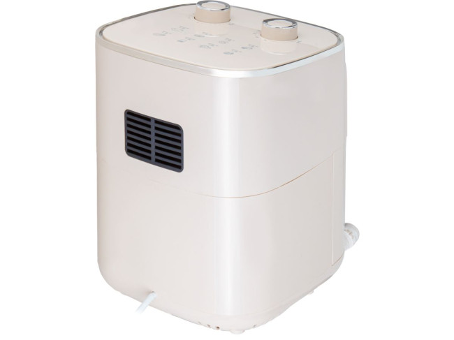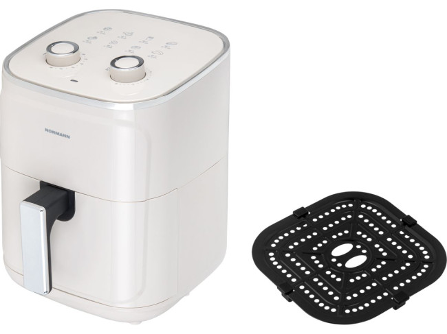 Аэрогриль белый с серебристой окантовкой. Корпус выполнен из ударопрочного пластика. Стальные рабочие поверхности чаши и гриль-решетка имеют устойчивое тефлоновое антипригарное покрытие.