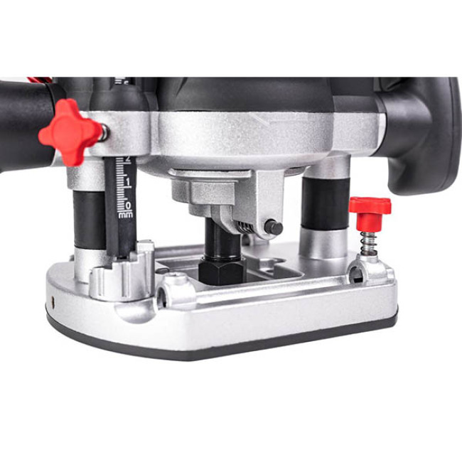 Отверстия основания позволяют фиксировать инструмент на верстаке, что гарантирует его устойчивое положение при работе. Блокировка шпинделя для быстрой смены фрез. Параллельный упор в комплекте для более точной работы. Удобные рукоятки для комфортной работы. Электронная регулировка оборотов для работы с разными материалами. Плавный пуск исключает малейшие перемещения фрезера во время начала работы. Управление оборотами холостого хода с помощью электроники. Тонкая настройка глубины фрезерования. Мощный мотор. Защита от перегрузок.