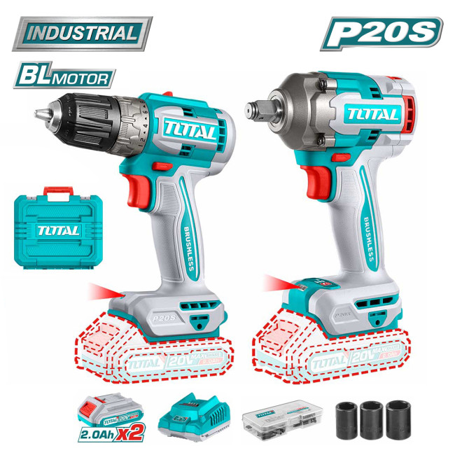 TOTAL TCKLI20271 – набор аккумуляторного инструмента для интенсивных (industrial) работ, включающий мощный гайковерт и дрель-шуруповерт.