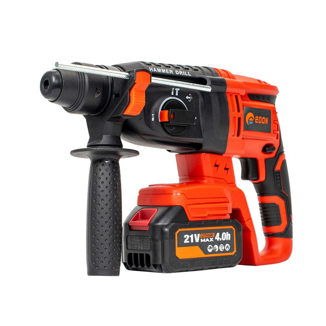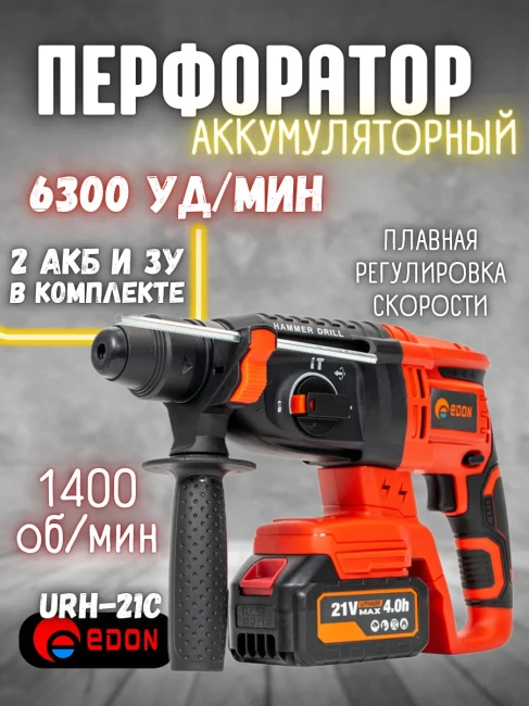 Перфоратор аккумуляторный Edon URH-21C бесщеточный - это инструмент, который станет незаменимым помощником при самых разнообразных строительных и ремонтных работах. Перфоратор имеет разнообразный функционал, так как способен работать в трех режимах: сверление, сверление с ударом и удар. Вы можете выбрать наиболее подходящий режим в зависимости от задачи. Бесщеточный двигатель обеспечивает эффективность работы, высокую износостойкость и длительный срок службы.