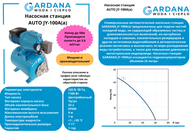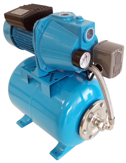 Насосная станция GARDANA AUTO JY-100А(а)(1.1kW) реализована на на базе поверхностного центробежного насоса JY-100А(а)(1.1kW) и гидроаккумулятором из углеродистой стали объемом 24л. Станция работает по настраиваемым порогам давления. Включение насоса происходит при достижении заданного минимального значения давления, а выключение при достижении заданного максимального значения.