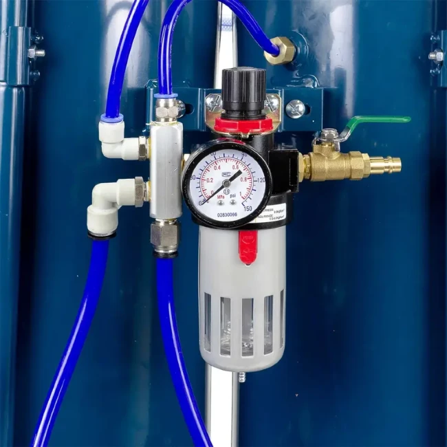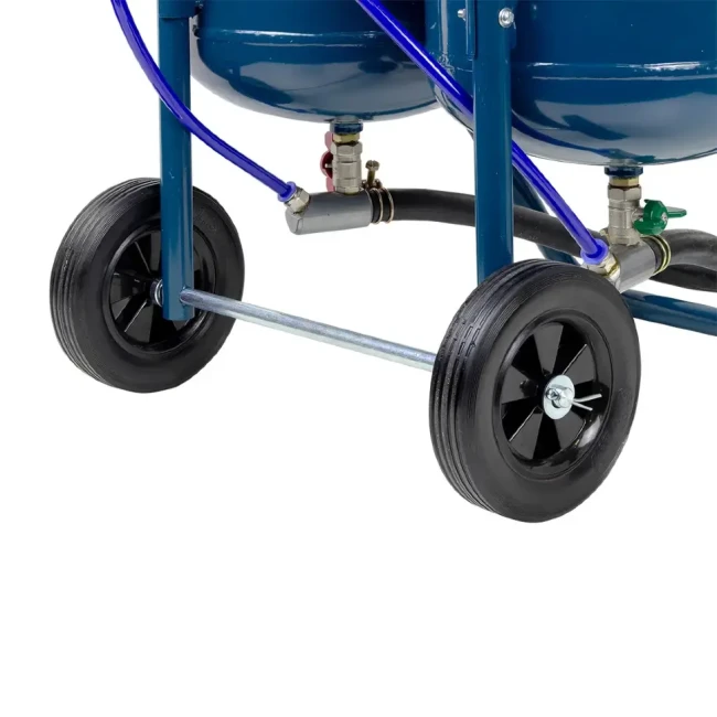 Передвижной пескоструйный аппарат напорного типа - это отличный выбор по реализации нужд для обработки поверхностей, деталей абразивными материалами при снятии окалины, ржавчины, грунта, упрочнения поверхностей, подготовке к покраске. Данный аппарат оснащён двумя баками для абразива, один бак для мягкой фракции (бикарбонат натрия), один для жёсткой фракции. Между фракциями можно переключаться во время работы благодаря кранам, которые установлены под пескоструйным пистолетом. Пескоструйный аппарат оборудован манометром, фильтром (влагоотдилитилем), пескоструйным пистолетом, одним соплом и шлангом.