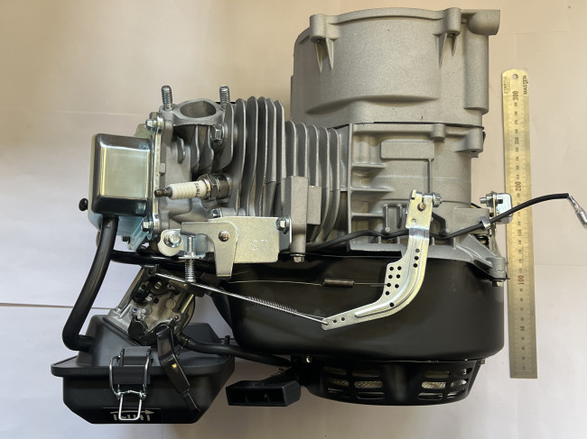 Механический регулятор оборотов двигателя. Вращение вала: против часовой стрелки. Система зажигания: магнето. Аварийная остановка по низкому уровню масла. Стандартная свеча.
