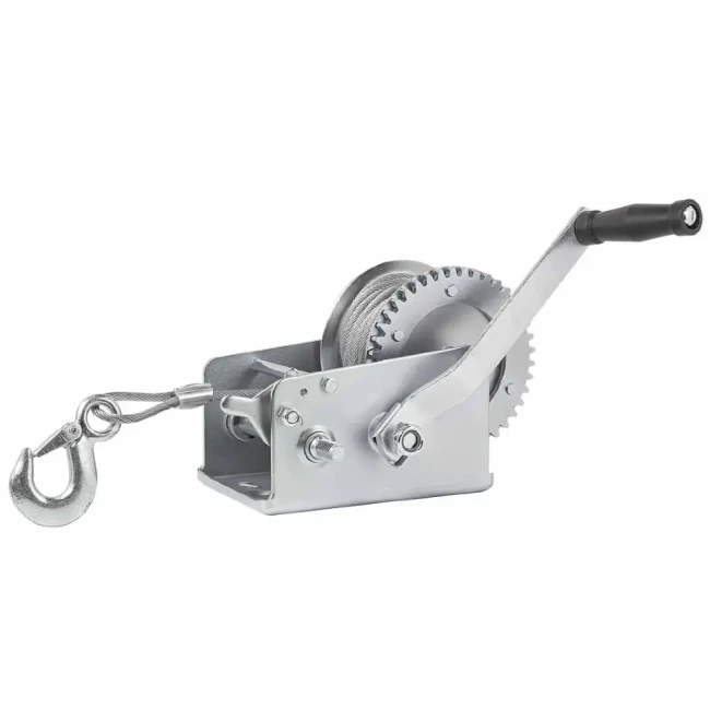 Ручная барабанная лебедка - механическое приспособление, которое используется для перемещения или подтягивания груза. Она работает по простому принципу: к грузу крепится крюк лебедки, соединённый при помощи ленты или троса с барабаном. Устройство подходит для использования на строительных площадках, в автосервисах и мастерских. Крюк лебёдки оснащен защитной скобой, которая исключает вероятность самопроизвольного соскальзывания лебедки с опорной балки. Лебёдку отличает простота конструкции и несложное управление. При вращении рукоятки во вращение приходит и барабан, на который наматывается трос - так создается тяговое усилие, которое приводит в движение груз. В случае необходимости лебедка стопорится храповым механизмом, который предотвращает самопроизвольное проворачивание барабана в обратную сторону под нагрузкой. Надёжность работы лебёдки обеспечивает конструкционная углеродистая сталь, которая применяется при изготовлении основных деталей - шестерней и осей. Её преимуществом является высокая прочность.